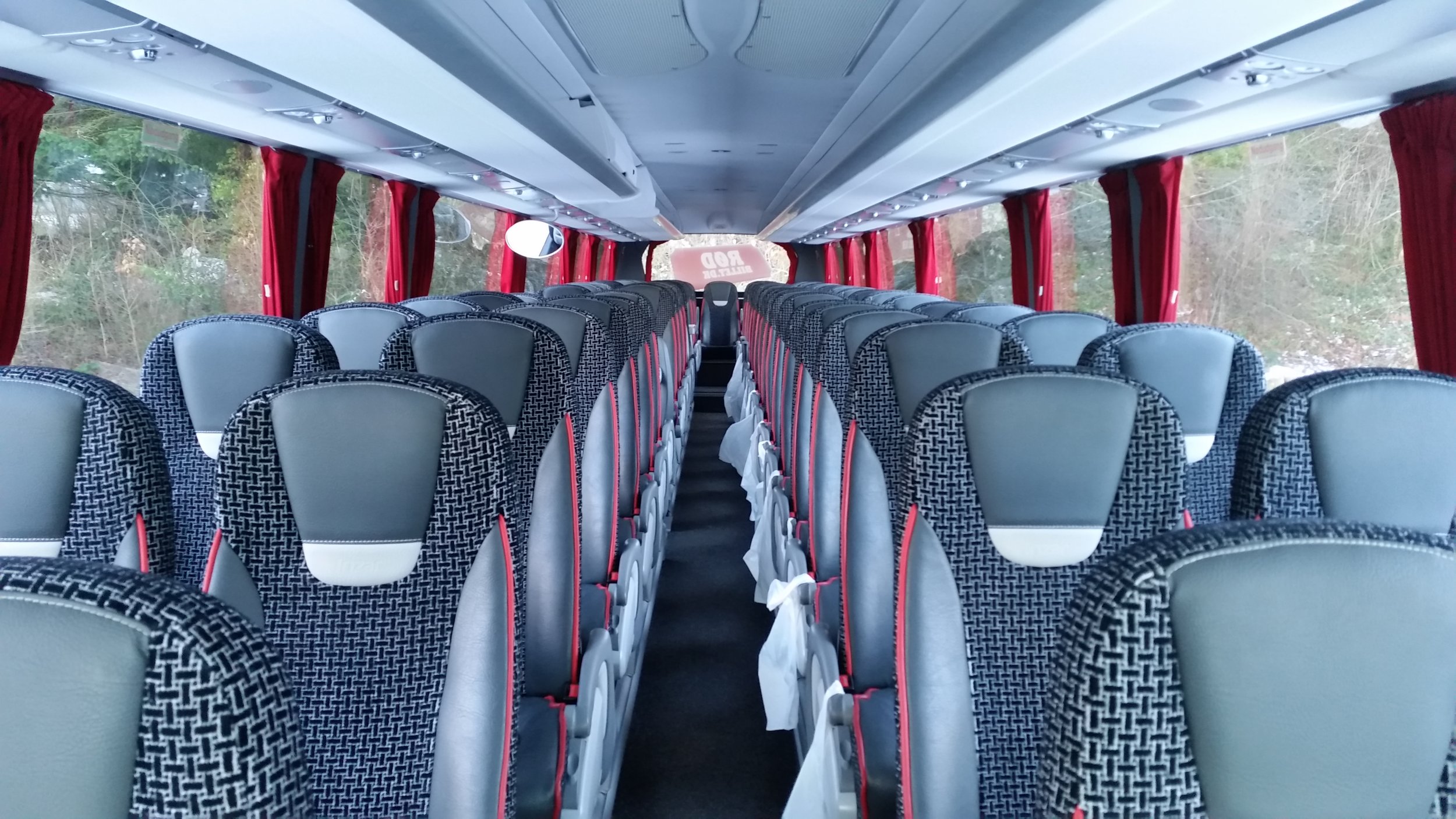Bussen har plads til 65 personer samt en guide, der er toilet i bussen, samt mulighed for at vi kan lave kaffe.