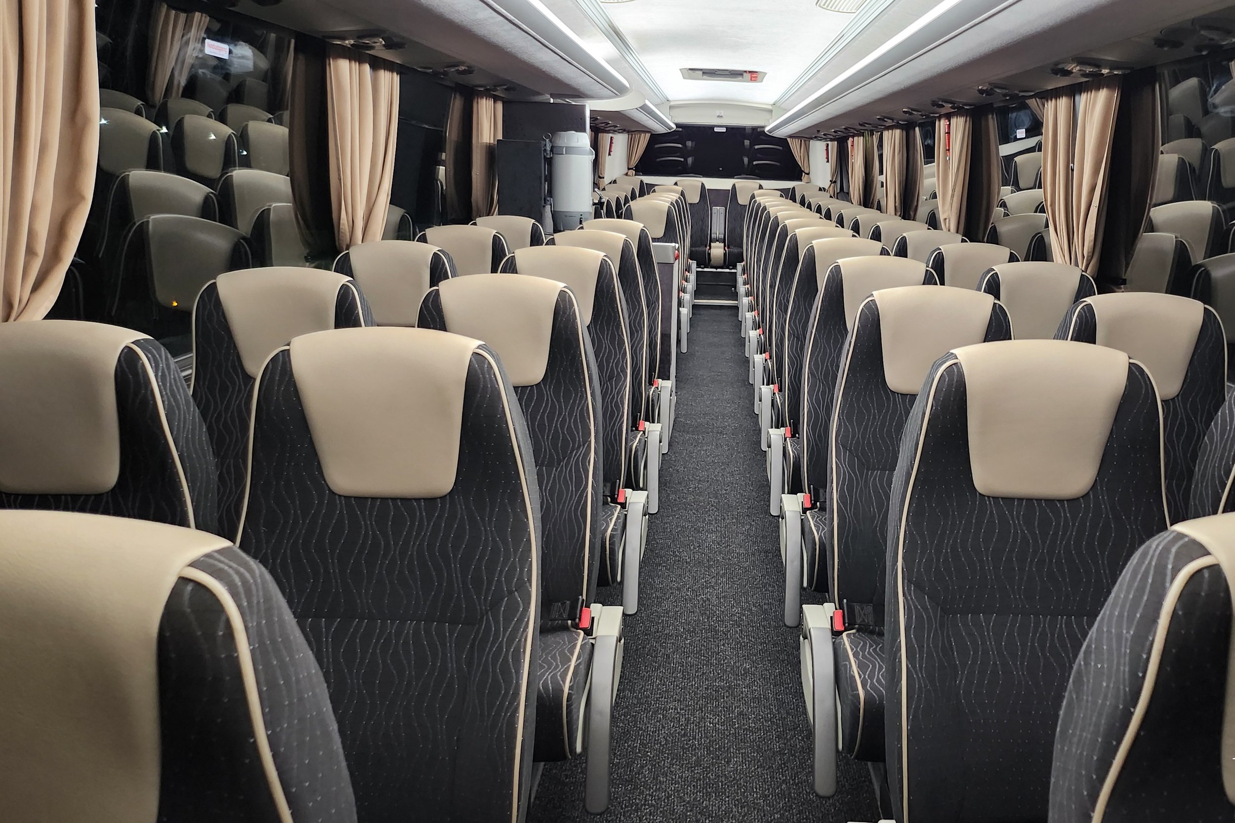 Stor turistbus, hvor der er plads til 52 personer samt en guide.